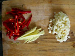 2红尖椒和杭椒切成段,再一切为二,葱切花,姜蒜切片。