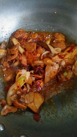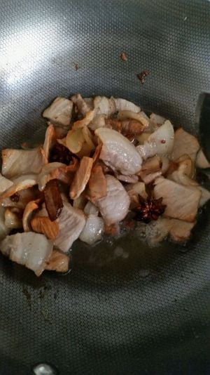 锅里放油,稍多一些,油热转小火放入肉和材料(除了大葱)翻炒,去除肉里肥油