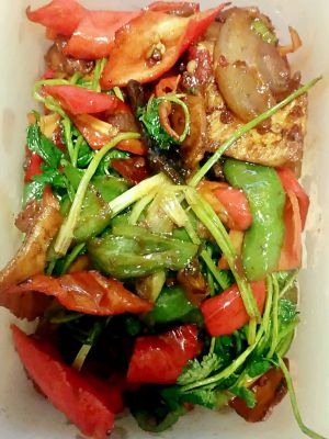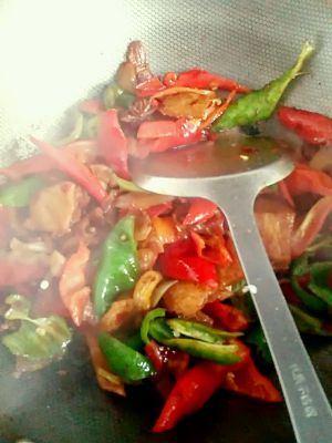 5放入青红椒一起翻炒,加盐1克,鸡精2克,糖2克,翻炒均匀后出锅~