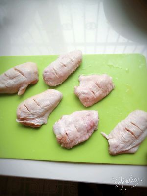 先将翅中洗干净,然后在一面用刀切几个口子,或者用牙签戳眼都可以,以便于入味!