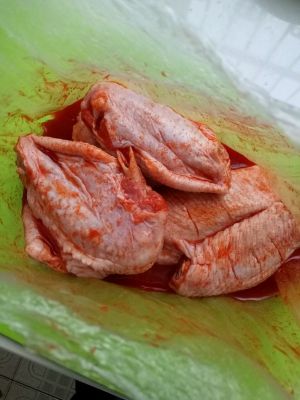 将鸡翅放在方便袋里,加入奥尔良调料和水搅和在一起!