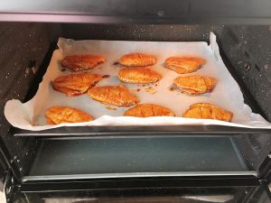 烤箱220℃, 中层, 烤10~15分钟,取出翻面, 重复5的动作, 再烤10~20分钟即可