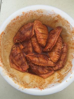 将腌肉粉,姜,蒜,油,酱油放入鸡翅中,抓均匀,腌制十分钟