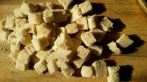 家里有的馒头,切成大小差不多的小方块。 放在冰箱的冷冻室里冻一会会更好切,还不掉渣。