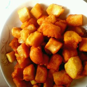 炸到外皮金黄色就可以出锅了。香喷喷的,特别脆,可以撒上材料,也可以蘸着番茄酱来吃。