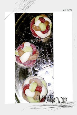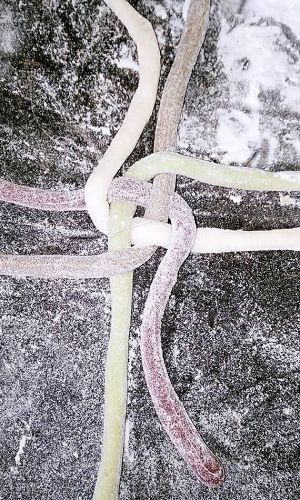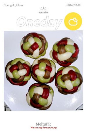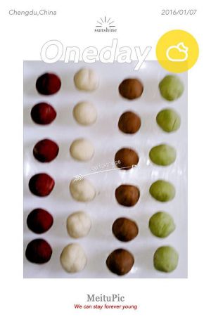 分别加入红曲粉、抹茶粉、可可粉,充分地揉入面团,盖上保鲜膜,松弛15-20分钟。