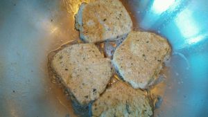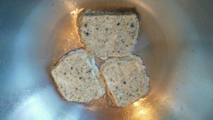 锅中放油,油热后,开小火,馒头片沾上海苔鸡蛋面糊,放入锅中,小火慢煎。