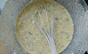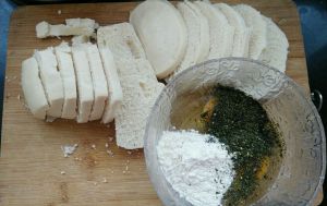 馒头切片,两个鸡蛋,面粉,海苔碎倒入碗中。