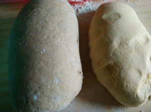 分别把牛奶.胡萝卜汁.白糖.酵母将 250G的面粉及509面粉.玉米面.豆面发酵成面团。