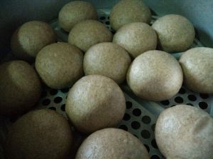 放置15分钟二次发酵,凉水蒸,上汽后25分钟(比较大),关火后5分钟开盖