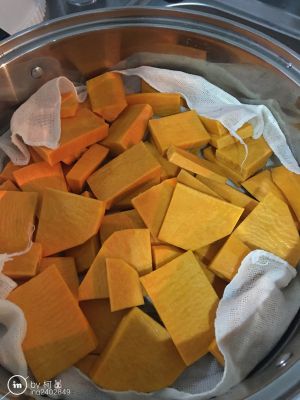 图二:南瓜君切一厘米左右厚片,上蒸锅大火蒸15分钟,筷子可以轻易插透为好,出锅凉到不烫手!
