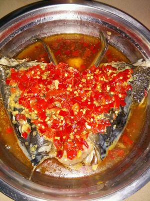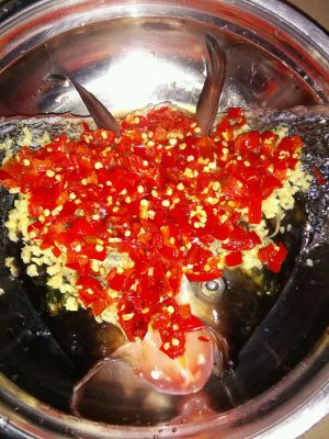 蒸锅水开后,上蒸架大火蒸十五至二十分钟(按鱼头大小决定时间)。炒锅加热花生油均匀浇上适量热油即可,期间准备不够完美,忘买葱,撕点葱花点缀会更赞哟!