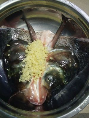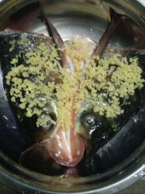 鱼头洗净划几道口,加盐,味精,胡椒粉和料酒腌制。