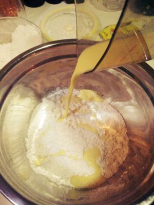 加入2300克面粉,转圈搅拌成没有干粉的棉絮状。