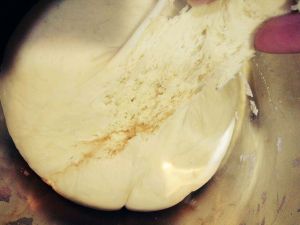 酵母用温水静置五分钟,同玉米汁一起和面。一次不要倒完,以免太稀。