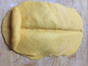 擀五个面皮,搓一个小条。五个面皮一个压一个摆放好