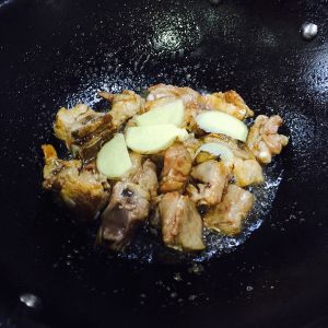 中火放入排骨翻炒,使糖色充分上色,放入酱油翻炒上色,最后放入料酒,鸡精,姜,蒜,桂皮,香叶,大料,枣,干辣椒,枸杞翻炒均匀。加入开水没过排骨中火盖上盖子焖煮30分钟