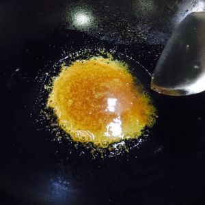 少放一点油加入白砂糖或者冰糖也可以,炒化,记住一定要小火,炒至棕褐色即可