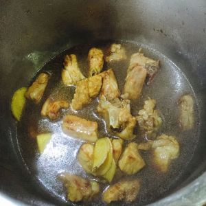 加黄酒,老抽,生抽。比例1:3:2。放入四五颗冰糖,喜欢甜的可以加。
