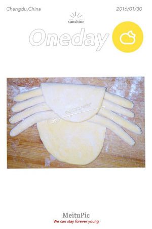 用擀面棒擀成牛舌状,做螃蟹的外壳。