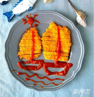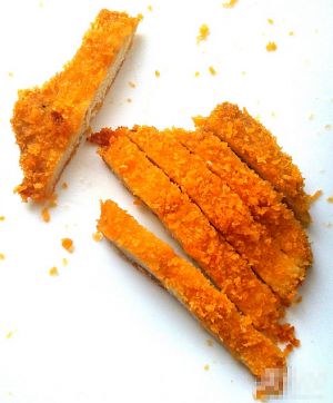 鸡胸肉解冻,切成薄片。入所有辅料(蛋液和面包糠除外)混合成的酱汁中腌制片刻