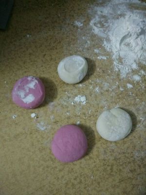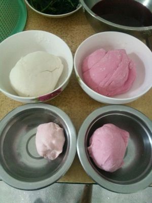 准备四个小碗,第一个碗是30度温水化开酵母,倒入面粉中,揉成白色面团,第二个碗是苋菜原汤汁化开酵母(一定要等汤汁凉到30度左右),倒入面粉中揉成紫色面团,第三个碗倒三分之二的苋菜原汤汁加一点温水化开酵母,倒入面粉中揉成浅些紫色面团,第四个碗加入三分之一苋菜原汤汁和三分之二的温水化开酵母,倒入面粉,揉成淡紫色面团,放温暖地方发酵至两倍大!