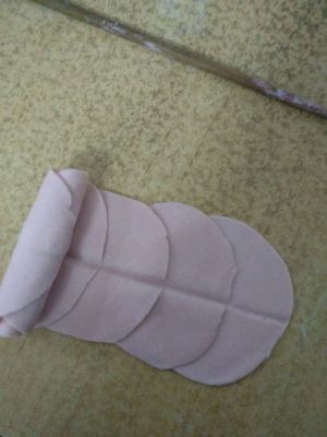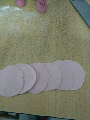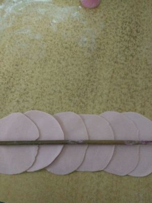 将剂子擀成中间厚,边缘薄点的面片!按图中依次摆放好!记住每个面片中间相隔不能太近,否则做出来的玫瑰花形状不好看。
