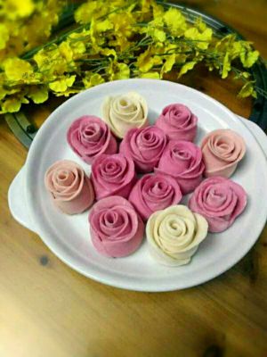 按照同样的方法,做好其他三种面团的玫瑰花。摆放在盘子上,放进蒸锅里,凉水下锅,蒸十二分钟。漂亮的玫瑰花馒头便做好了。(有浅色的,也有深色的哦。)