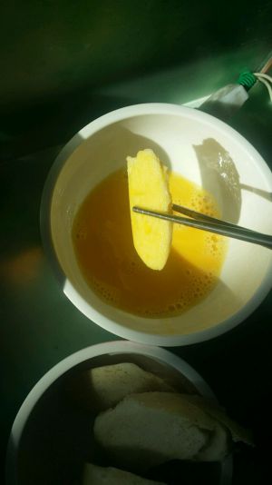 把馒头片放在蛋液里滚一滚。让馒头片均匀的沾上蛋液。