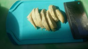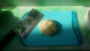 用刀切成大小相等的馒头生坯,两头的面团放在一起揉成半圆形