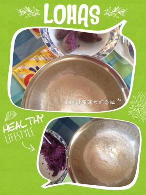 在面粉中加入紫薯粉。准备35℃酵母水。
