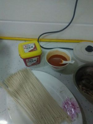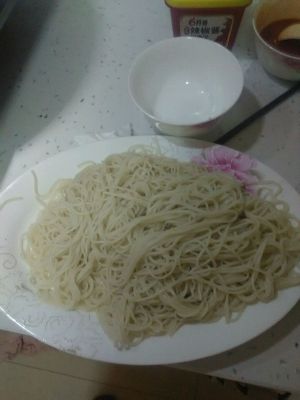 将干粗面条下入锅中煮至七八成熟捞出控水,注意锅里倒入一点油防面条粘