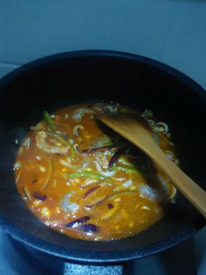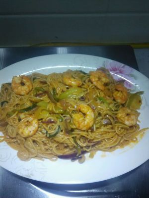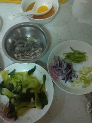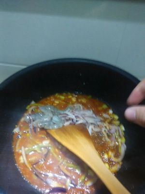 虾仁熟后 汤汁稠密后把面放入翻炒 可加少量的酱油 和盐