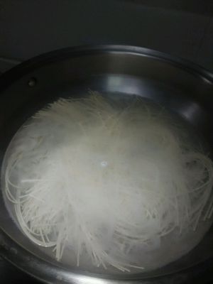 芦笋丝、胡萝卜丝、木耳丝焯水;猪肉丝焯水。