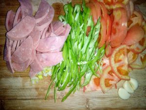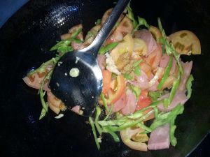 葱花蒜末爆香柿子尖椒火腿入锅翻炒十三香一小勺盐一小勺