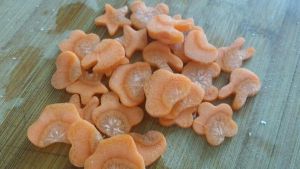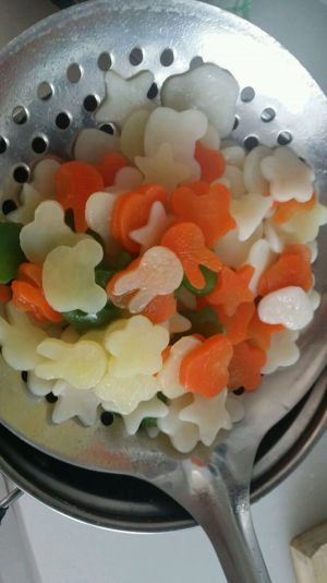取胡萝卜,土豆片,青椒,用模具扣出造型。
