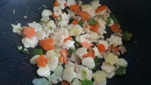 所有原料放一起炒熟,如果不烂糊,可以放一点水煮一下。可以弄成汤面,我做的是炒面