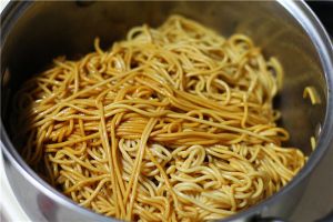 放油面后放老抽上色,着小火翻炒三分钟