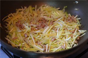 锅内放入一勺油烧热后下肉丝滑炒,加料酒3ml翻炒均匀