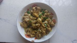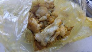尖椒切碎和蒜末放在碗里 翅根去骨,切成适当大小 放入塑料袋,加入咖喱粉,胡椒粉,盐和几滴麻油隔袋按摩抓匀入味
