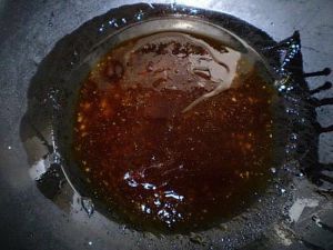 锅内留少许底油,入冰糖小火加热至融化,小火熬成黄色糖浆