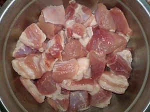 将五花肉洗净切成三厘米见方的小块,加少许料酒,淀粉,花椒腌制半小时