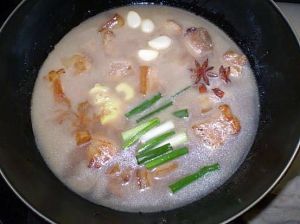 待肉的表面微焦,且榨出许多的猪油来,倒入滚开水与肉持平
