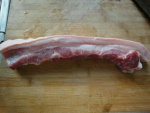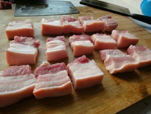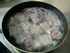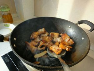 五花肉清洗干净后切大块,沥干水分;生姜清洗干净切片,小葱切成小段的葱花备用; 炒锅烧热后,倒入食用油,开大火,放姜片,煸炒一下,再倒入五花肉进行翻炒,直至红肉变白;