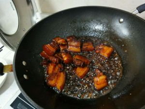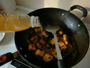 爆炒到肉的油份逼出,外表金黄,放入一大瓶黄酒