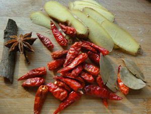 放调料,姜片,八角,花椒,桂皮,稍多,胡椒,丁香,荜葧,肉蔻,香叶少量,炒一会加醋,酱油,根据个人口味加入干辣椒。