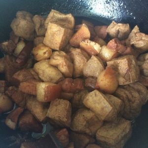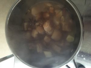 待锅里的肉完全冷却,加入要同焖的东西,例如鸡蛋,土豆,海带...加水再焖一次,约20-30分钟即可。