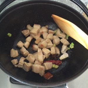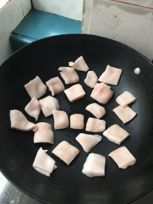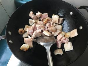 锅点火烧干水,小火,把没有瘦肉的块肥肉朝下贴在锅上,慢慢熬出油。