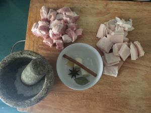 肉洗净擦干水切块,没有瘦肉的分开放。冰糖砸碎,配料备好。