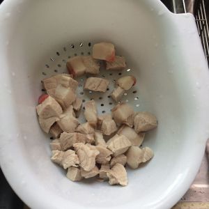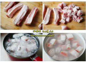 五花肉洗净去毛切小块,放在开水里汆烫,然后倒出,冲冷水至完全冷却